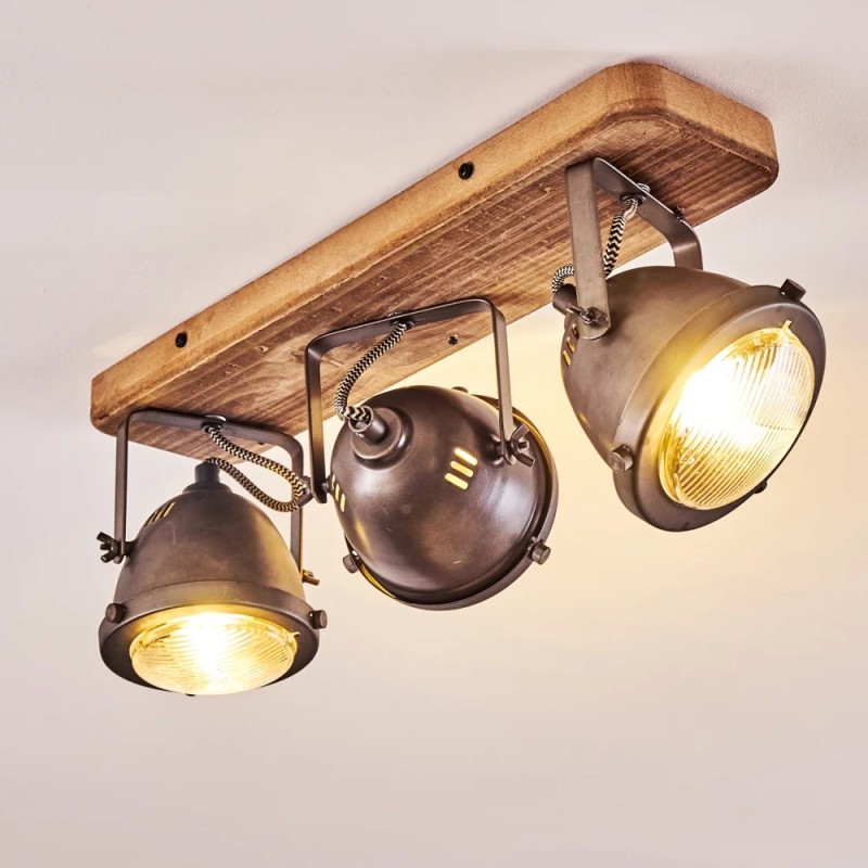 Přisazené reflektorové industriální světlo Brilliant, 3x GU10, textilní kabel, sklo, dřevo, pálená ocel