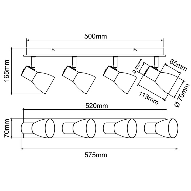 Svítidlo tvoří 4 kovová stínidla v bílé barvě, která doplňují dřevěné detaily. Jednotlivé reflektory lze otáčet všemi směry, okolo své osy i nahoru a dolů. Moderní design svítidla dotváří bílá hranatá rozeta se světlým dřevem.