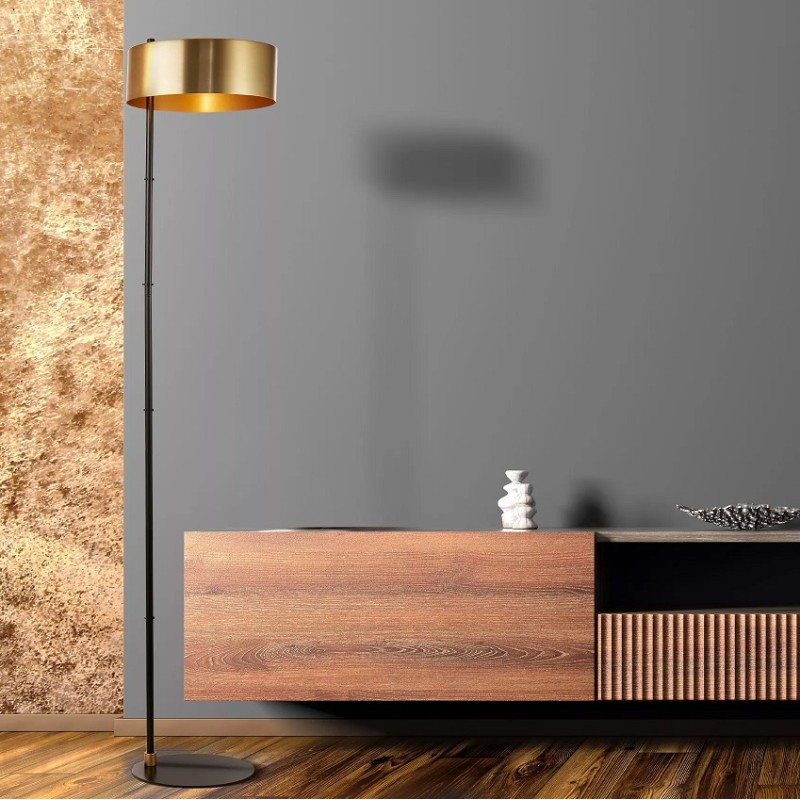 Stojanová lampa KNOX v atraktivním provedení představuje moderní doplňkové osvětlení pro Váš interiér. Celokovové svítidlo je vyrobeno v oblíbené černé barvě v kombinaci s výrazným kulatým stínidlem v matné zlaté barvě. Celokovové stínidlo vytvoří příjemný směrový zdroj světla, který svítí jedním směrem, a to dolů. Lampa je tak ideální volbou pro osvětlení při práci či četbě, zcela jistě poslouží i jako výrazný designový prvek v interiéru, volně postavená vedle sedací soustavy nebo obývákové stěny.