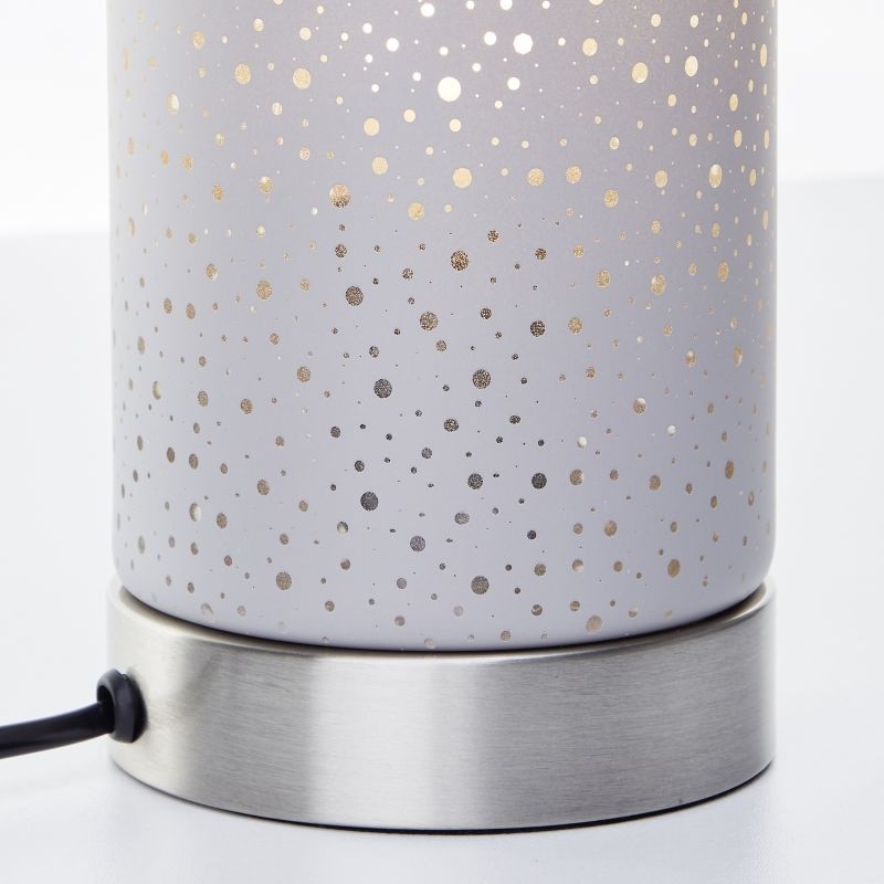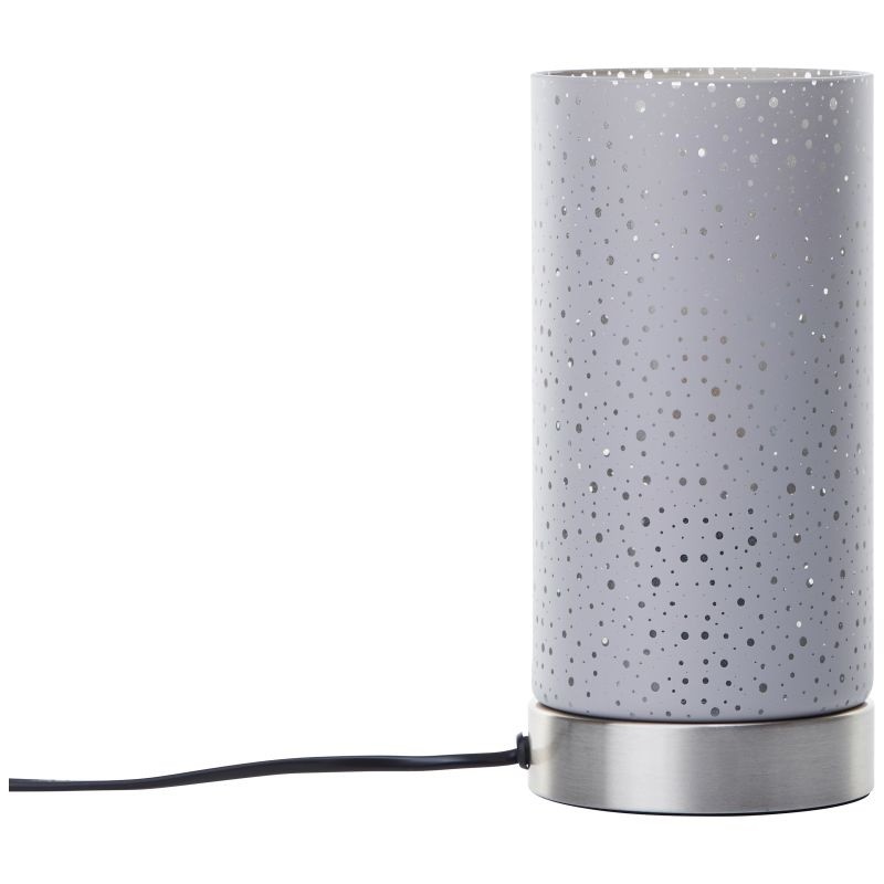 Skleněná stolní lampa SCARLETT v tradičním provedení, kterému dominuje skleněné stínidlo o průměru 11cm a výšce 22,5cm zazáří nejen na nočním stolku, jeho atraktivní jakoby děrované provedení vytvoří v okolí lampy zajímavý světelný efekt. Originální stínidlo v moderní šedé barvě je fixováno na stabilní kovové kulaté podnoži, která je v provedení broušený chrom. Dohromady tyto 2 materiály vytvářejí dokonalou barevnou kompozici, která v interiéru vytvoří příjemné ambientní osvětlení.