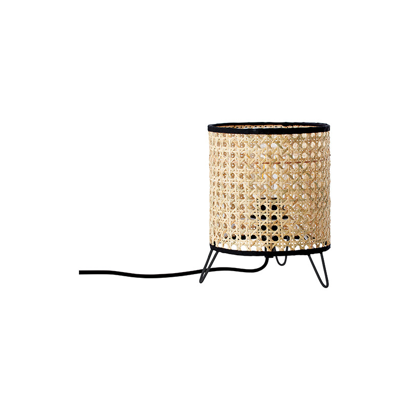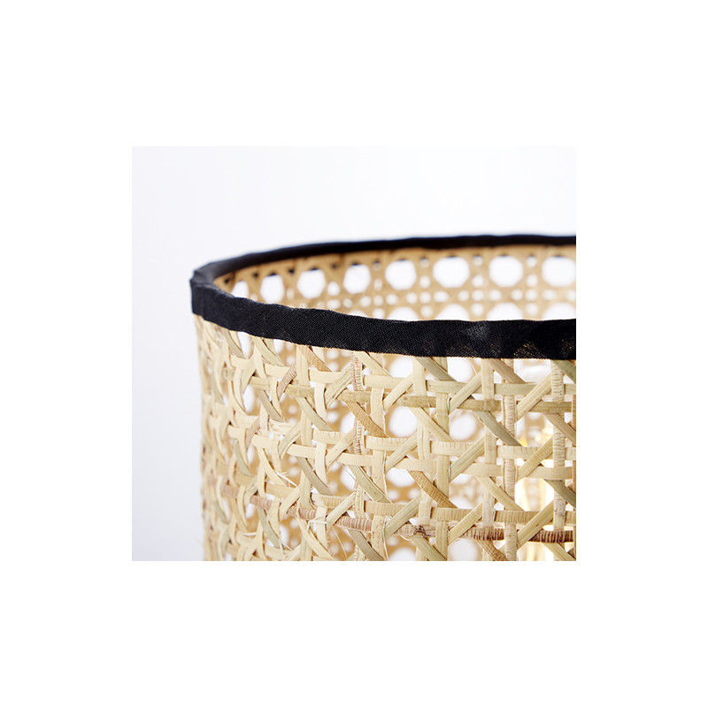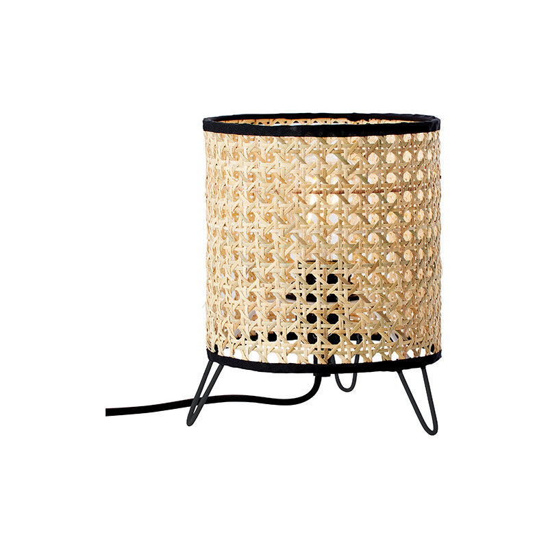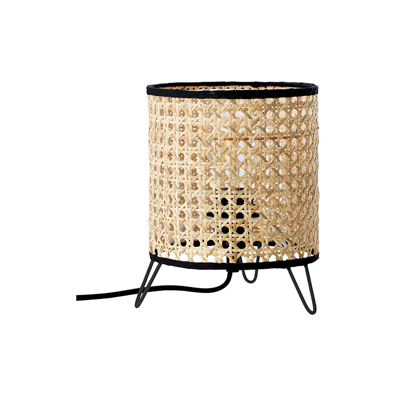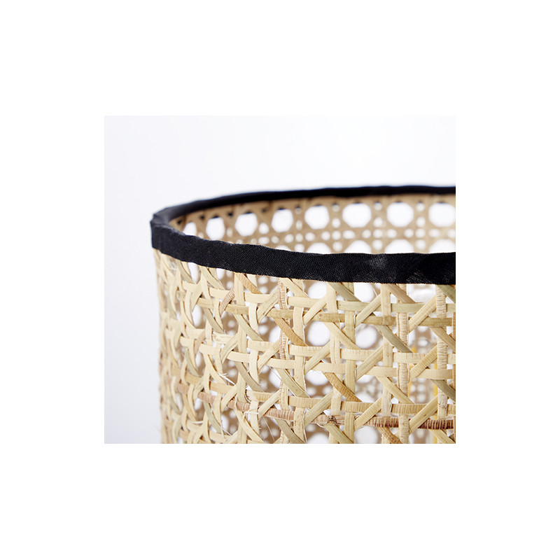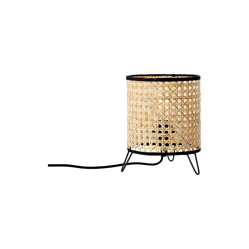 Stínidlo v klasickém kulatém tvaru v přírodní barvě ratanu je originálně doplněno jemným černým lemem, který koresponduje s ostatními kovovými částmi v černé barvě. Skrz ratanové stínídlo na 3 kovových nožkách proniká světelný tok žárovky uvnitř a vytváří příjemné, částečně tlumené doplňkové osvětlení v interiéru.