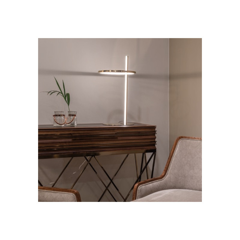 Futuristický design stolního svítidla LOZANNA je tvořen jedním masivním světelným kruhem o průměru 30cm skrz který prochází stojanová noha lampy o délce 55cm. Oba tyto prvky jsou svítící, ukrývají v sobě výkonné integrované LED diody, které vytvářejí kvalitní osvětlení v interiéru.