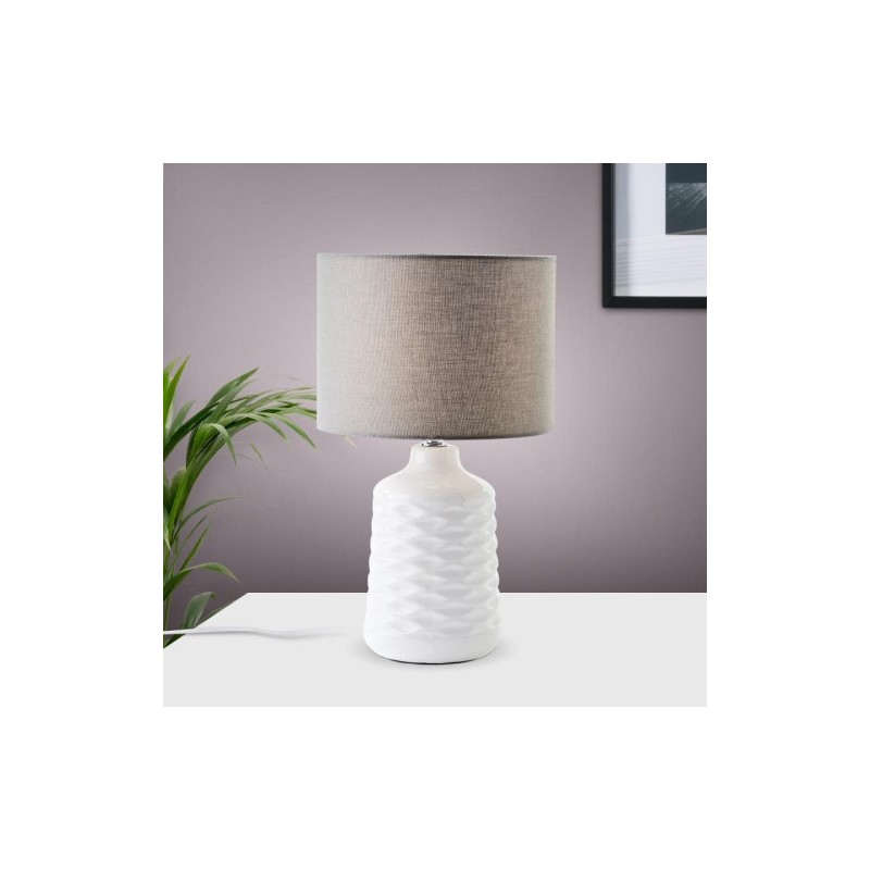 Keramická noha lampy zaujme svým originálním plastickým motivem, který je umocněn lesklou bílou barvou a jedinečným tvarem. Ušlechtilé strukturované stínidlo lampy o průměru 25cm je vyrobeno z kvalitní textilie v šedé barvě.