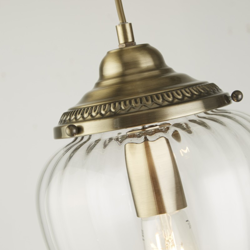 Stylové závěsné svítidlo MOSCOW zaujme svým originální tvarovým provedením, kterému dominuje úchvatné žebrované čiré sklo zspod zakončené jemným "knoflíkem" a výrazně dekorované kovové prvky v provedení antická mosaz (patina).