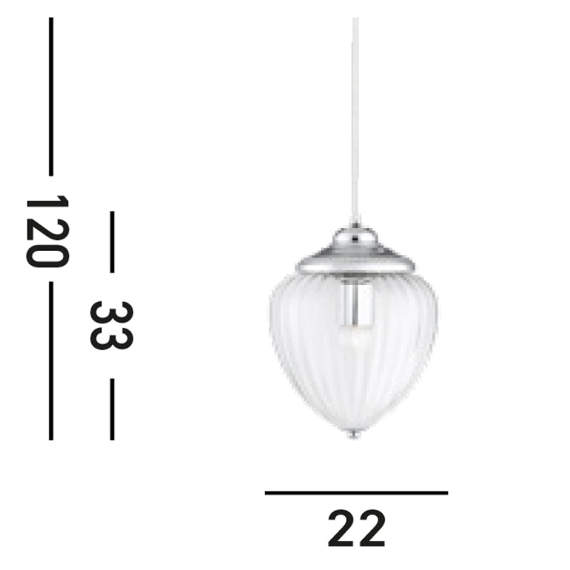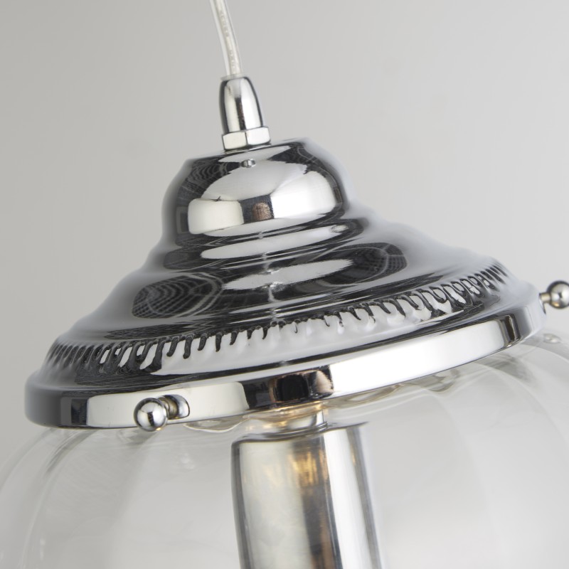 Stylové závěsné svítidlo MOSCOW zaujme svým originální tvarovým provedením, kterému dominuje úchvatné žebrované čiré sklo zspod zakončené jemným "knoflíkem" a výrazně dekorované kovové prvky v provedení lesklý chrom.