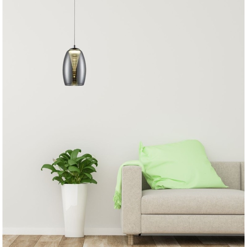 Tělo svítidla tvoří skleněné stínidlo zavěšené na samonosném lanku, jehož celkovou délku 105cm lze zkrátit dle potřeby a fixované na stropní kulaté rozetě. Výrazný oblý tvar vnějších čirých skel v kouřovém odstínu o výšce 22cm je uvnitř originálně doplněn o vnitřní čiré sklo ve tvaru pyramidy s výraznou liniovou strukturou, která dotváří originální design svítidla. Uvnitř jsou totiž rafinovaně ukryty výkonné LED zdroje, jež pyramidové sklo díky své strktuře rozptyluje a vytváří tak jedinečný světelný efekt, který je umocněn vnějším sklem v kouřové barvě. Tyto 2 skleněné materiály dohromady tvoří dokonale sladěný originální celek a dotvářejí luxusní vzhled celé série osvětlení METROPOLIS.
