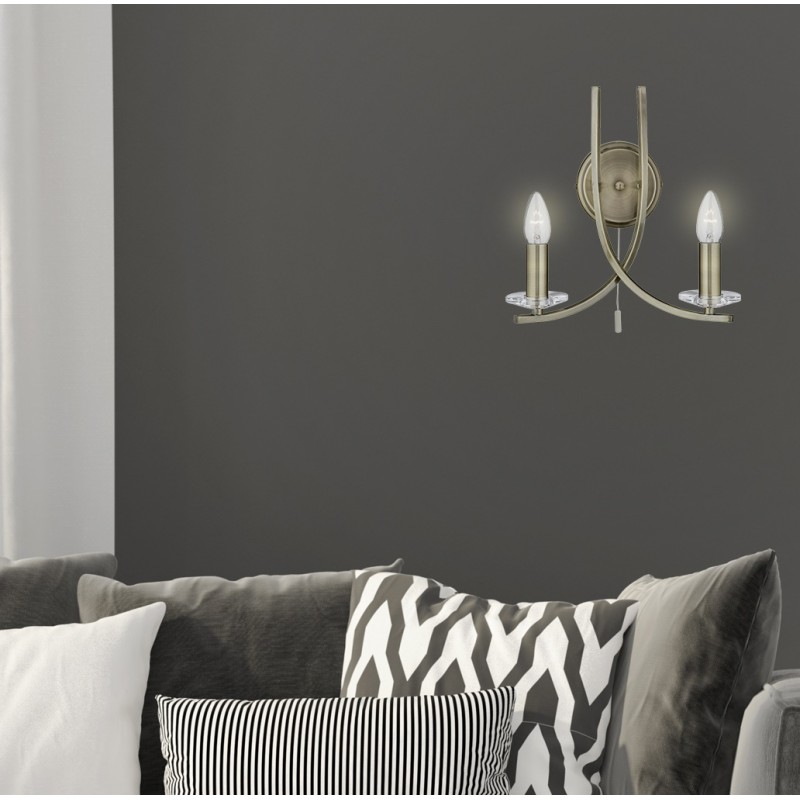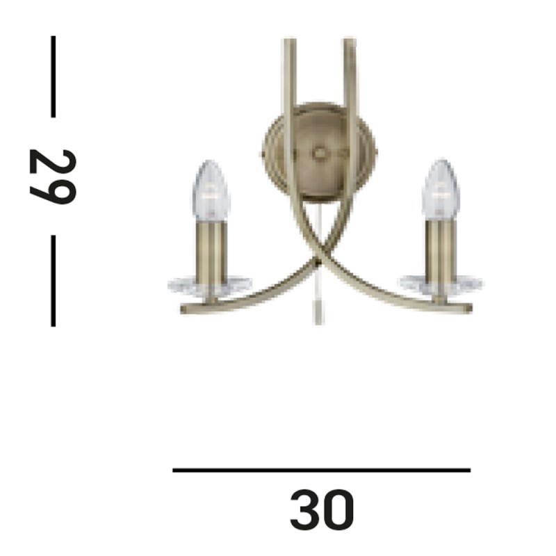 Nástěnné svítidlo ASCONA dokonale rozzáří klasicky i moderně zařízený interiér. Svítidlo je vyrobeno z oceli v teplém odstínu antické mosazi - patiny. Tělo lampy je tvořeno 2-mi jemně prohlými rameny na jejichž konci je umístěna dekorativní patice v barvě, která je ideální pro žárovky ve tvaru svíčky. Patice je doplněna o detail z čirého skla, který dotváří originální design celé řady svítidel ASCONA. Lampička je doplněna o šňůrový spínač, díky kterému lze lampu ovládat přímo v místě instalace.