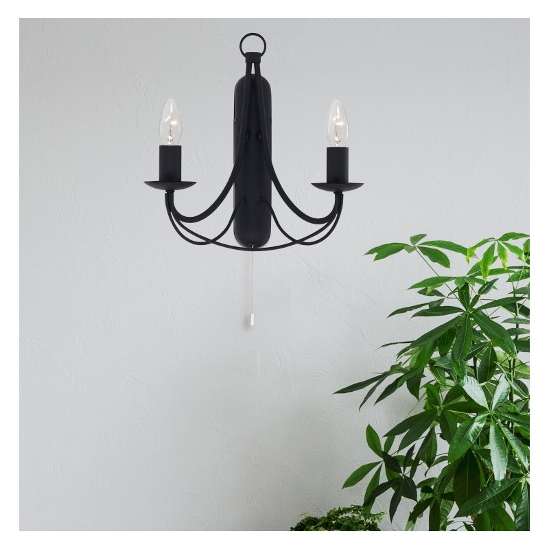 Svítidlo je vyrobeno z oceli v moderní nadčasové barvě matná černá. Tělo lampy je tvořeno 2-mi prohlými rameny na jejichž konci je umístěna dekorativní patice v barvě, která je ideální pro žárovky ve tvaru svíčky. Svítidlo je doplněno o jemné prohlé kovové linie, které jsou specifické pro celou sérii svítidel MAYPOLE.