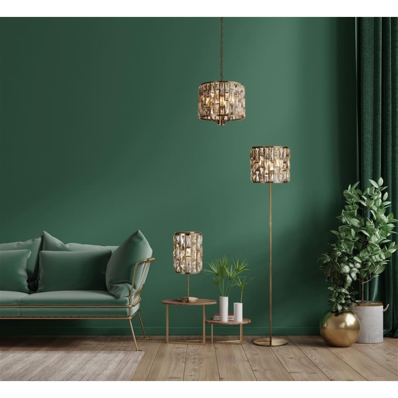 Designové stojanové svítidlo BIJOU zaujme svým originálním zpracováním z klasických materiálů, kdy je kov v luxusním provedení kombinován s čirým jemně tónovaným sklem. Stínidlo svítidla je tvořeno kovovou konstrukcí v barvě antická měď (patina) v kulatém tvaru o průměru 26cm. Výrazné stínidlo tvoří jemná ocelová konstrukce, která dělí stínidlo na jednotlivé kvadratické prvky, ve kterých jsou natěsno zavěšeny broušené ověsy třech velikostí. Originální barva skleněných ověsů v odstínu CHAMPAGNE dotváří celkový hřejivý dojem a jejich třpyt dodá svítidlu luxusní nádech.
