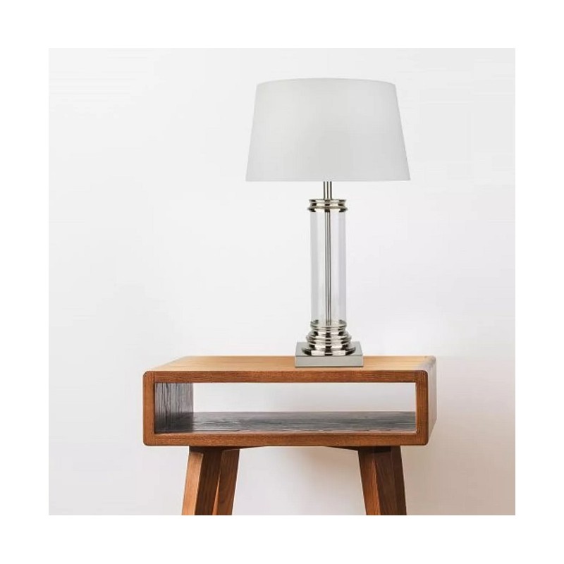 Stylové stolní svítidlo anglického výrobce Searchlight PEDESTAL zaujme svým luxusním provedením s použitím klasických materiálů. Dominantním prvkem lampy je originálně zpracovaná masivní podnož a stojan z čirého skla, skrz které je jasně viditelná kovová část svítidla. Kovové prvky lampy jsou v provedení broušený (matný) chrom. To vše je doplněno o klasické krémově bílé textilní stínidlo o průměru 37cm a výšce 21cm.