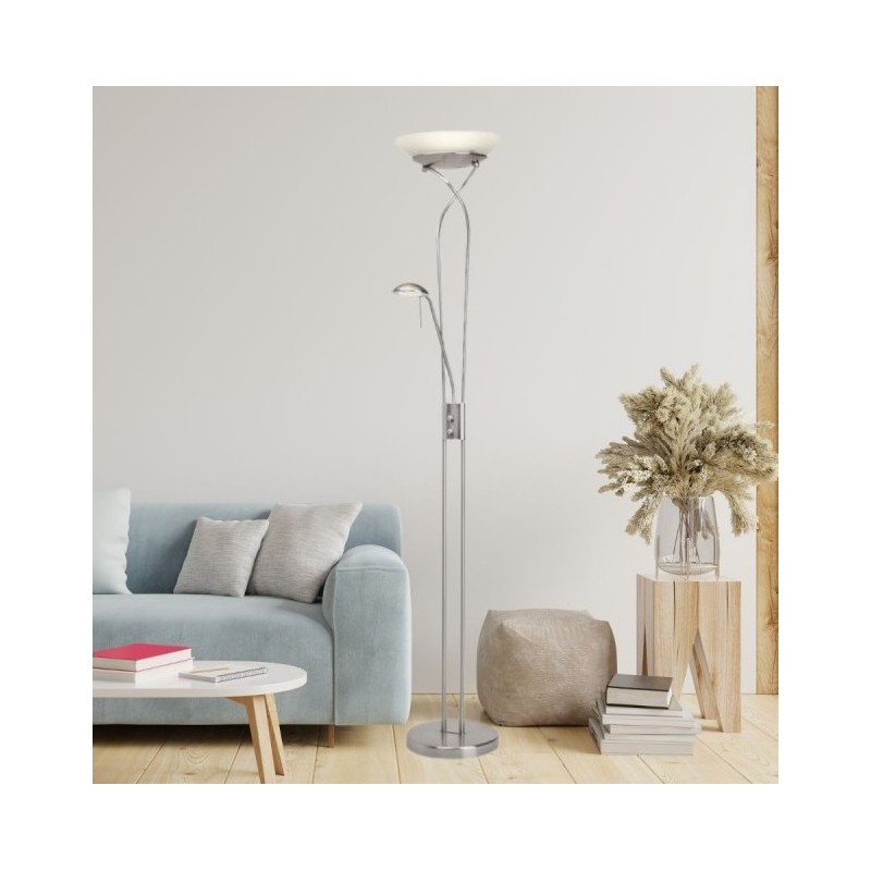 Stmívatelné stojanové svítidlo Brilliant, 1 x LED 18W Up-Light, 1 x LED 4,5W čtecí rameno, satinovaný chrom, bílé sklo, 2x reostat