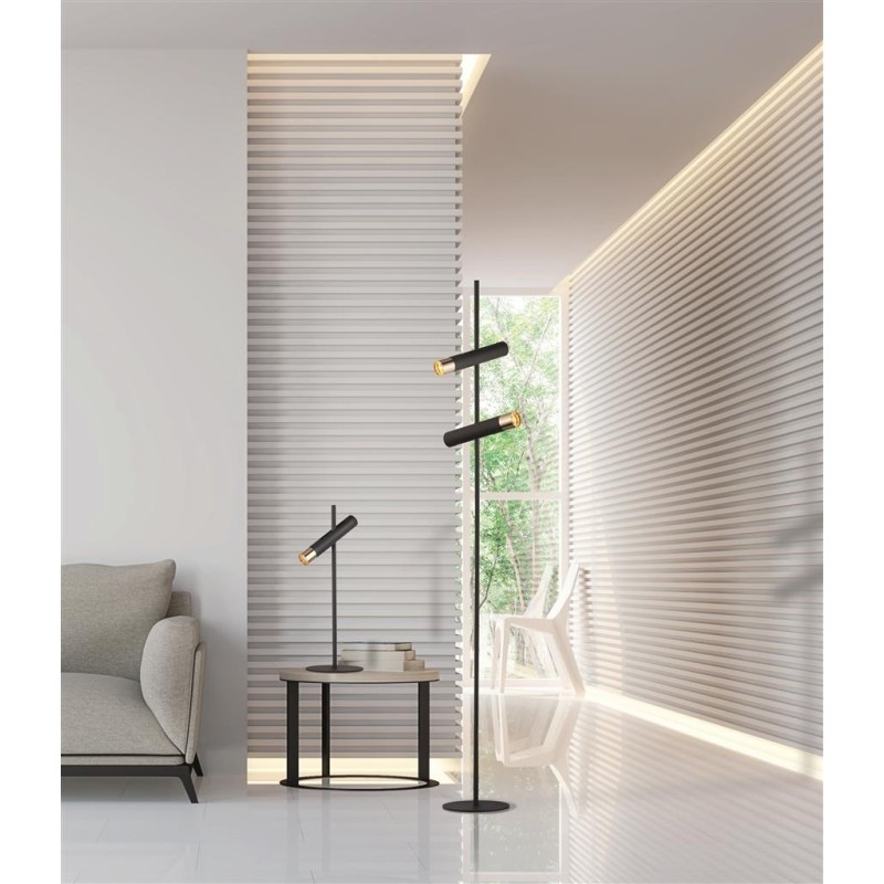 Stolní lampa CYLINDER v atraktivním provedení představuje moderní doplňkové osvětlení pro Váš interiér. Celokovové svítidlo je vyrobeno v černé barvě v kombinaci s širokým zlatým lesklým lemem na konci reflektoru, který představuje výrazný prvek a dotváří unikátní design svítidla.. Tato oblíbená barevná kombinace se skvěle hodí do moderního, stylového i klasicky zařízeného interiéru.