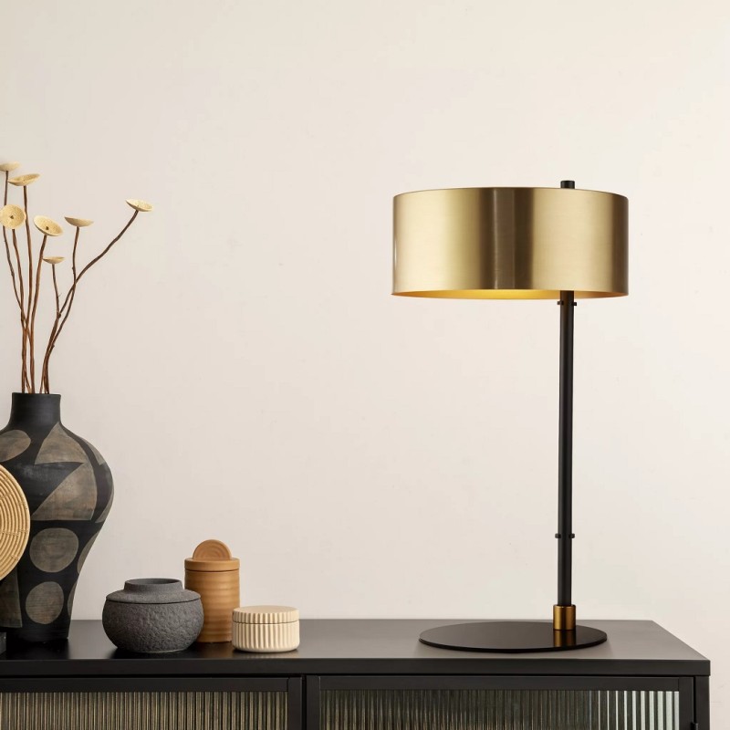 Stolní lampa KNOX v atraktivním provedení představuje moderní doplňkové osvětlení pro Váš interiér. Celokovové svítidlo je vyrobeno v oblíbené černé barvě v kombinaci s výrazným kulatým stínidlem v matné zlaté barvě. Celokovové stínidlo vytvoří příjemný směrový zdroj světla, který svítí jedním směrem, a to dolů. Lampa je tak ideální volbou pro osvětlení při práci či četbě, zcela jistě poslouží i jako výrazný designový prvek v interiéru na komodě či nočním stolku.