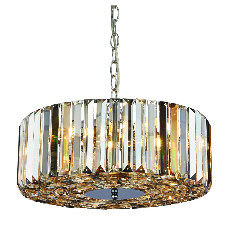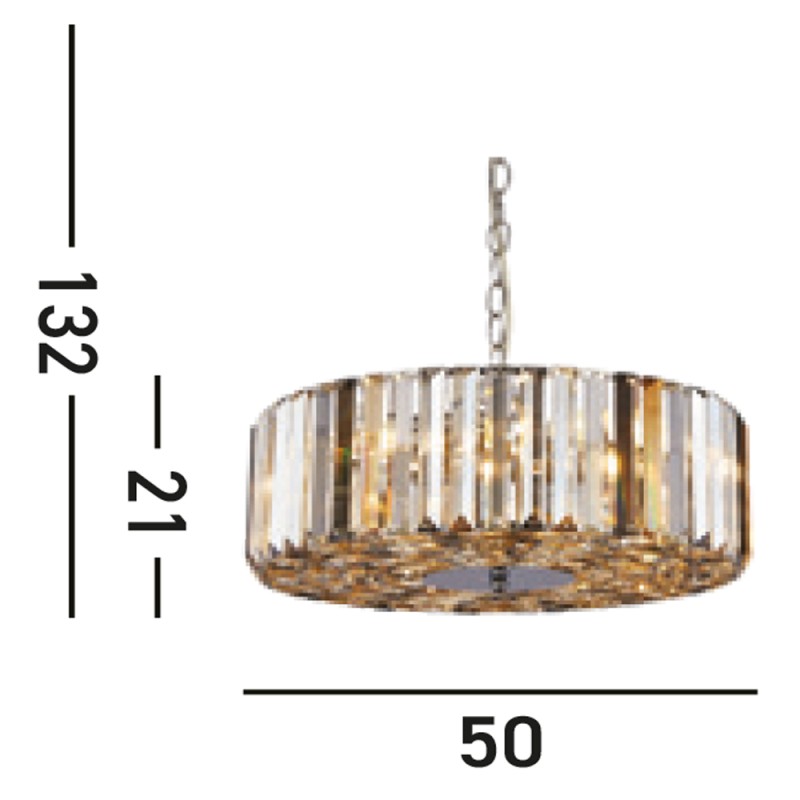 Výrazné stínidlo v klasickém kulatém tvaru o průměru 50cm a výšce 21cm tvoří skleněné ověsy dlouhé 21cm v jehlanovém provední. Originální barevná kombinace 3 duhů skel čisté čiré, jemné kouřové a hřejivé jantarové sklo dohromady dodají svítidlu luxusní nádech, který vytvoří ve Vašem interiéru příjemnou ambientní atmosféru.