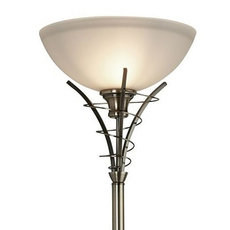 Tělo svítidla je vyrobeno z kovu v povrchové úpravě anticka mosaz - patina, která vytváří příjemný hřejivý dojem. Podstava lampy v horní části pod stínidlem se originálně rozchází do 3 symetrických dílu, které jsou jemně zdobeny spirálovitým kroucením. To vše jakoby podpírá výrazné skleněné stínidlo z bílého leptaného skla v bílé barvě půlkulatého tvaru o průměru 30cm.