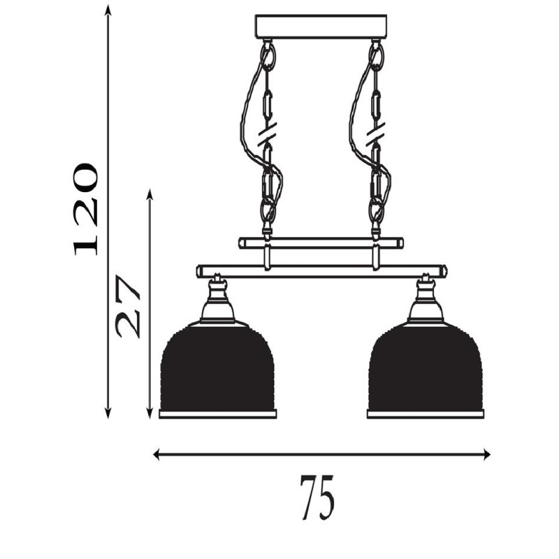 Světelná rampa se 2-mi stínidly o průměru 27cm, která jsou fixována na rampě sestává ze 2 jemných tyčí v asymetrické délce. To vše je volně zavěšeno na 2 řetězích v barvě, jejichž závěsnou délku lze upravit dle potřeby. Šířka stropní lišty je 30cm.
