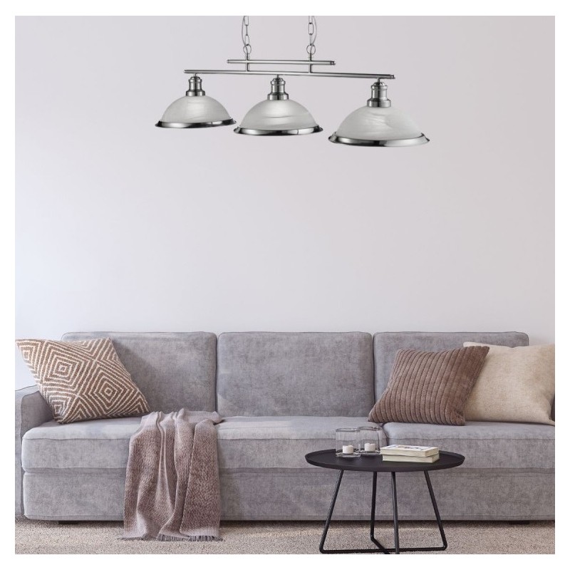 Moderní závěsné svítidlo BISTRO v klasickém avšak nadčasovém designu je ideální volbou pro osvětlení klasicky zařízeného i moderního interiéru. Tělo svítidla je vyrobeno z broušeného chromu, stínidla jsou sklěněná v provedení alabastrové (mramorové) bílé sklo. Světelná rampa se 3-mi stínidly o průměru 28cm jsou fixována na rampě ze 2 jemných tyčí v asymetrické délce. To vše je volně zavěšeno na 2 řetízcích v barvě, jejichž závěsnou délku lze upravit dle potřeby.