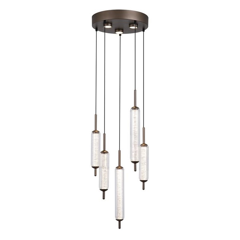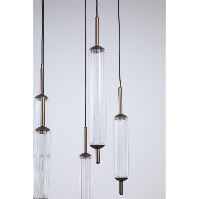 Jedinečná série interiérového osvětlení CATTAIL zaujme svým luxusním provedením, kterému dominují oblé tvary atraktivních tvarových skel. Krása skel rozzáří váš interiér i díky třpytívému efektu s jemnými bublinkami, který je umocněn světlem zkrz ně procházejícím. Pět skleněných podlouhlých stínidel je vyrobeno v klasickém oválném z čirého skla s jemným žebrováním, uvnitř doplněna o druhé vnitřní sklo. Skla jsou zakončena dekorativnými kovovými krytkami po obou stranách.