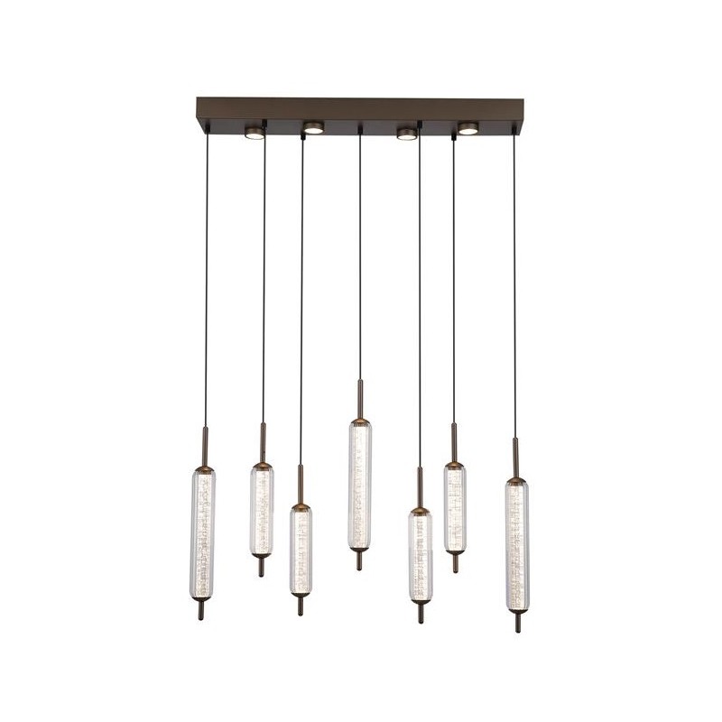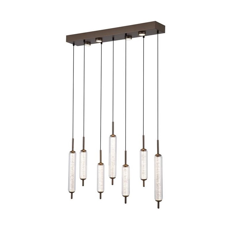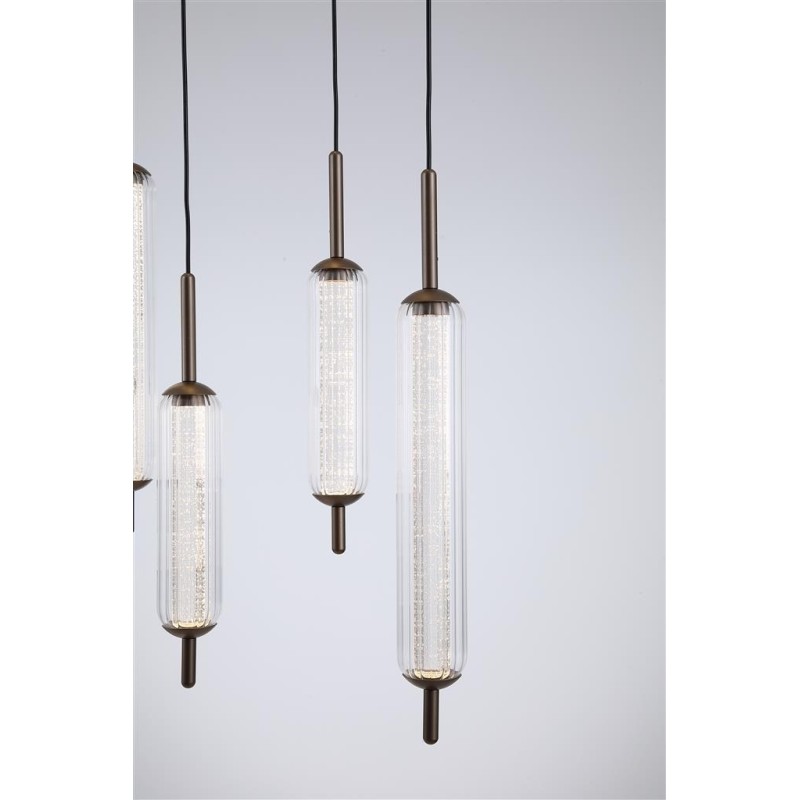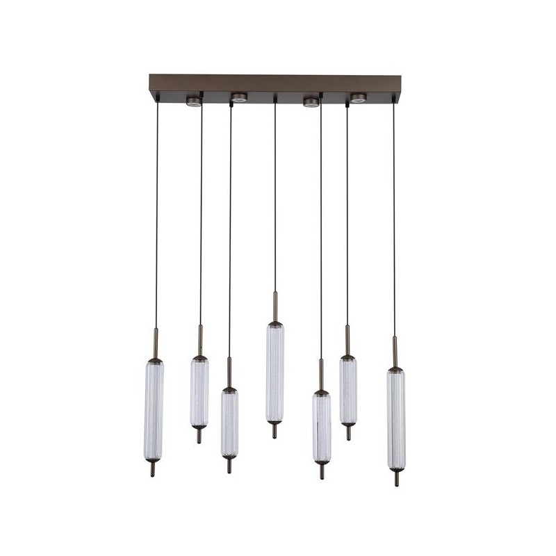 Jedinečná série interiérového osvětlení CATTAIL zaujme svým luxusním provedením, kterému dominují oblé tvary moderních tvarových skel. Krása skel rozzáří váš interiér i díky vyjímečnému třpytívému efektu, který je umocněn světlem zkrz ně procházejícím. Sedm skleněných podlouhlých stínidel je vyrobeno v klasickém oválném tvaru z čirého skla s jemným žebrováním, uvnitř jsou doplněna o druhé vnitřní sklo. Skla jsou zakončena dekorativnými kovovými krytkami po obou stranách.