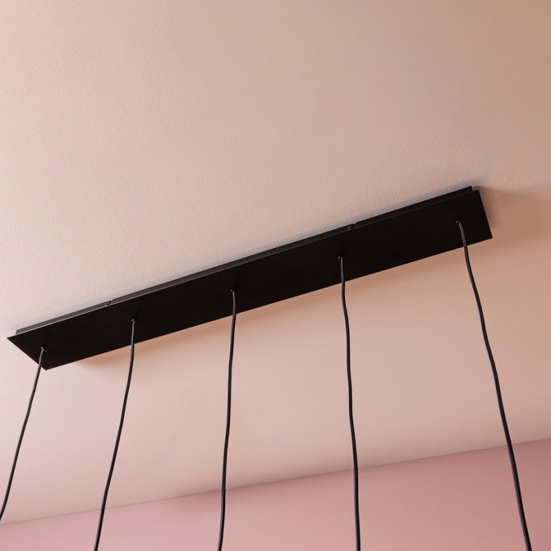 Tělo svítidla tvoří 5 stínidel zavěšených na obdélníkové stropní rozetě 95 x 12cm na dlouhých lankách. Celkovou závěsnou délku jednotlivých lanek lze upravit dle potřeby.