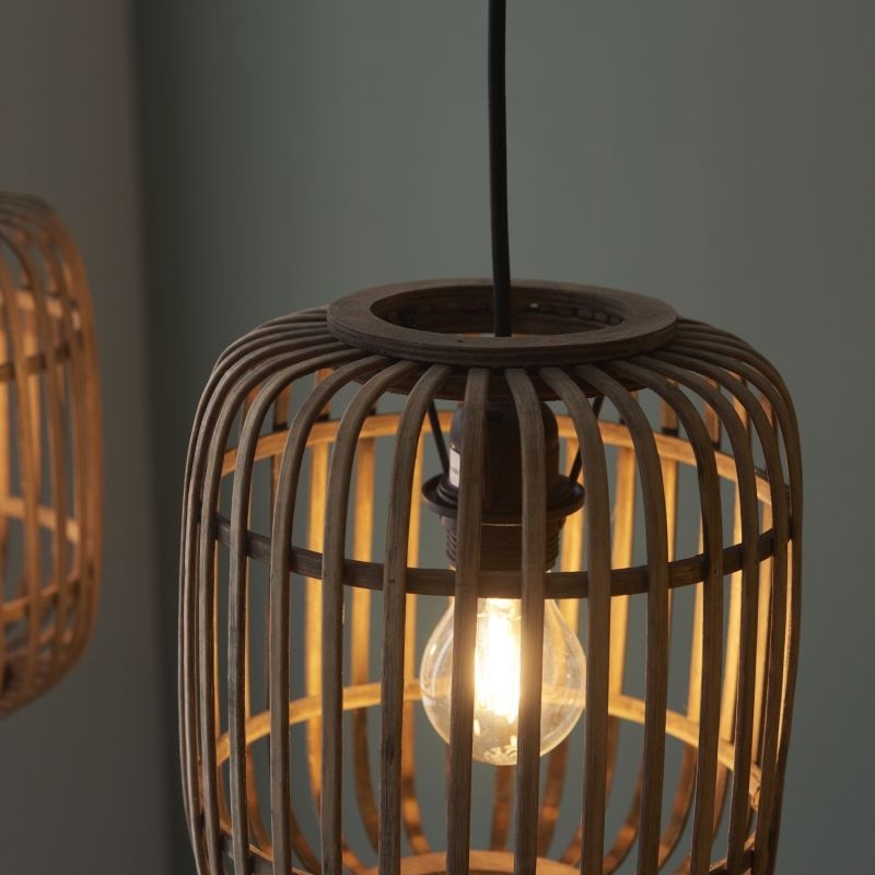 Stínidla v originálním kulatém tvaru o průměru 21cm jsou vyrobena ze surového dorůstajícího ratanu, který tak představuje materiál šetrný k přírodnímu prostředí. Tři stínidla v prostoru utvářejí výraznou dominantu v přírodním odstínu, skrz bambusové linie proniká světelný tok žárovek uvnitř a vytváří tak v interiéru originální světelné efekty. Stínidla jsou zavěšena na černých textilních kabelech padajících z černé stropní lišty, jejich závěsnou délku lze upravit dle potřeby. Ostatní kovové prvky jsou také černé barvě.