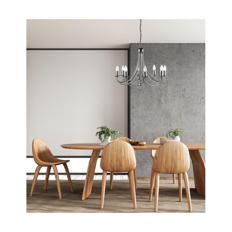 Svítidlo je vyrobeno z oceli v nadčasové barvě broušený chrom. Tělo lustru je tvořeno 8-mi prohlými rameny na jejichž konci je umístěna dekorativní patice v barvě, která je ideální pro žárovky ve tvaru svíčky. Svítidlo je doplněno o jemné prohlé kovové linie, které jsou specifické pro celou sérii svítidel MAYPOLE.