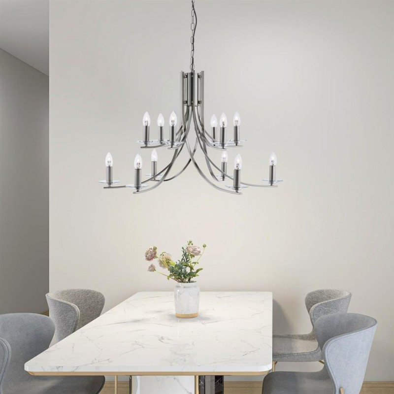 Velký závěsný lust ASCONA dokonale rozzáří klasicky i moderně zařízený interiér. Svítidlo je vyrobeno z oceli v luxusním odstínu lesklý chrom. Tělo lustru je tvořeno 12-ti jemně prohlými rameny ve 2 řadách na jejichž konci je umístěna dekorativní patice v barvě, která je ideální pro žárovky ve tvaru svíčky. Patice je doplněna o detail z čirého skla, který dotváří originální design celé řady svítidel ASCONA. To vše je zavěšeno na kovovém řetězu v barvě, jehož délka je nadstandarní 207cm. Celková výška lustru je 262cm a lustr je tak díky tomu vhodný do místností s vysokým stropem. Celkovou maximální délku řetězu lze zkrátit dle potřeby.