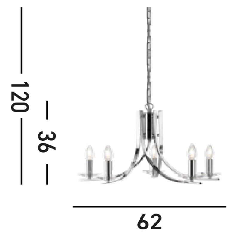 Závěsný lust ASCONA dokonale rozzáří klasicky i moderně zařízený interiér. Svítidlo je vyrobeno z oceli v luxusním odstínu lesklý chrom. Tělo lustru je tvořeno 5-ti jemně prohlými rameny na jejichž konci je umístěna dekorativní patice v barvě, která je ideální pro žárovky ve tvaru svíčky. Patice je doplněna o detail z čirého skla, který dotváří originální design celé řady svítidel ASCONA. To vše je zavěšeno na kovovém řetězu v barvě, jehož celkovou maximální délku 54cm lze upravit dle potřeby.