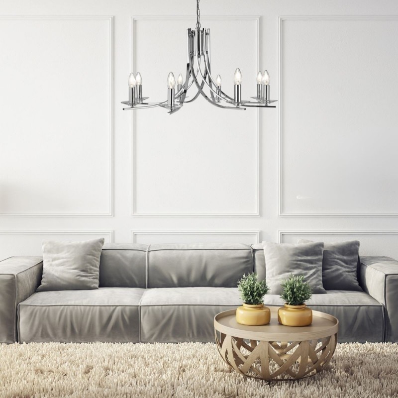 Velký závěsný lust ASCONA dokonale rozzáří klasicky i moderně zařízený interiér. Svítidlo je vyrobeno z oceli v luxusním odstínu lesklý chrom. Tělo lustru je tvořeno 8-mi jemně prohlými rameny na jejichž konci je umístěna dekorativní patice v barvě, která je ideální pro žárovky ve tvaru svíčky. Patice je doplněna o detail z čirého skla, který dotváří originální design celé řady svítidel ASCONA. To vše je zavěšeno na kovovém řetězu v barvě, jehož celkovou maximální délku 104cm lze upravit dle potřeby.