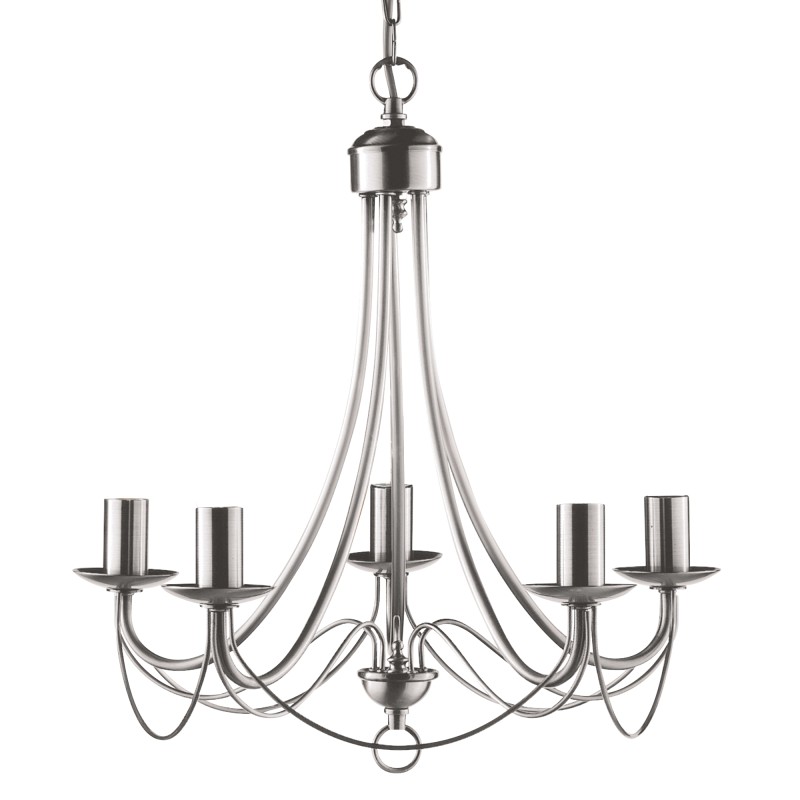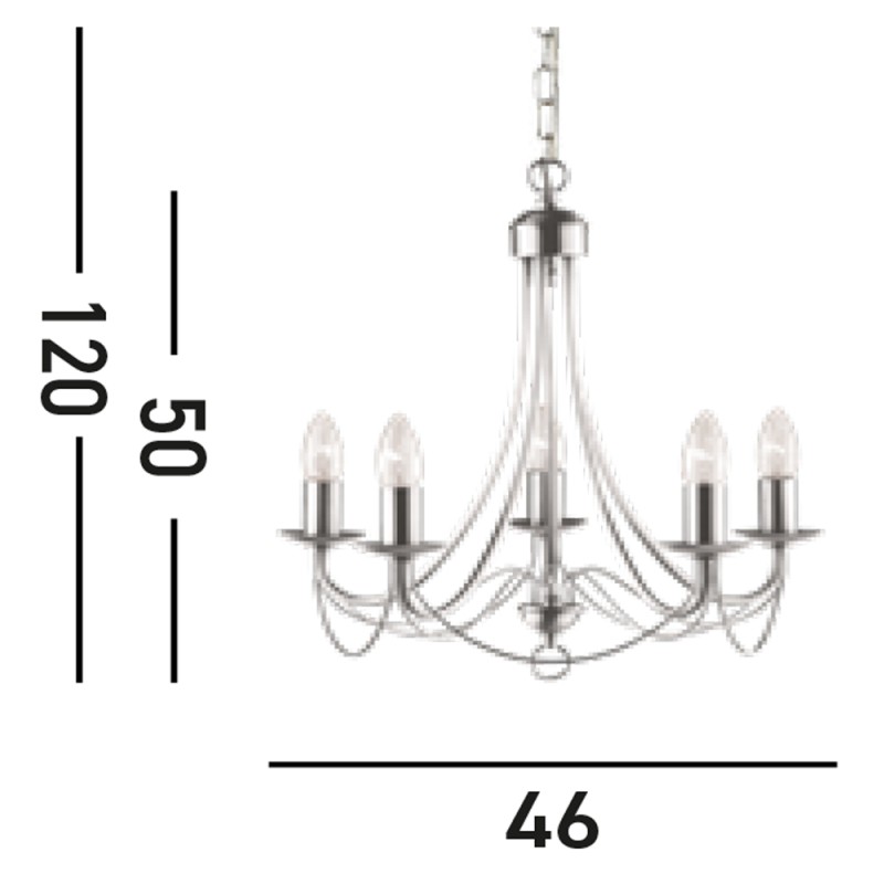 Svítidlo je vyrobeno z oceli v nadčasové barvě broušený chrom. Tělo lustru je tvořeno 5-ti prohlými rameny na jejichž konci je umístěna dekorativní patice v barvě, která je ideální pro žárovky ve tvaru svíčky. Svítidlo je doplněno o jemné prohlé kovové linie, které jsou specifické pro celou sérii svítidel MAYPOLE.