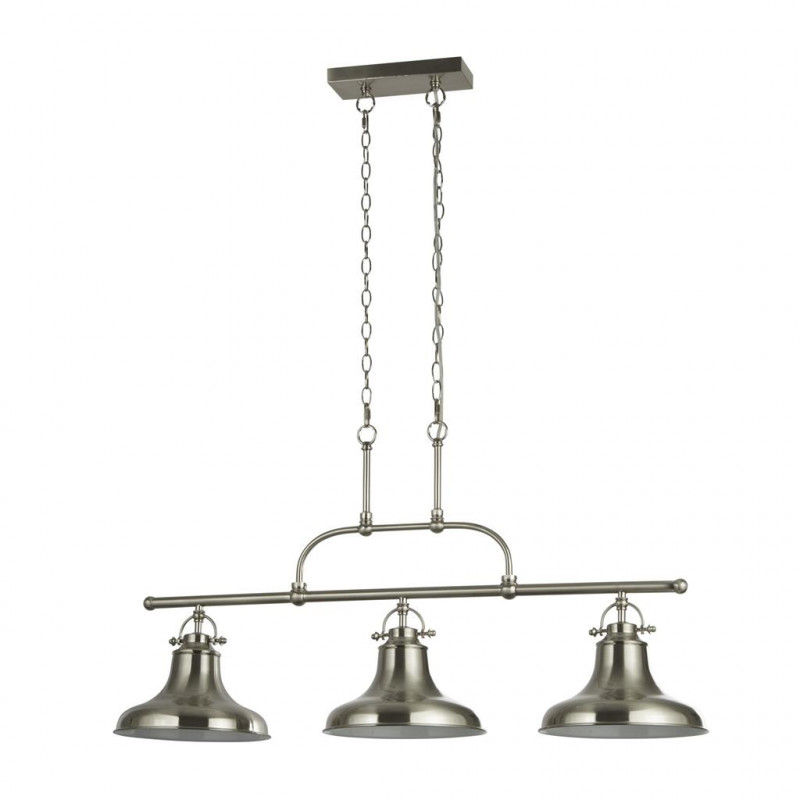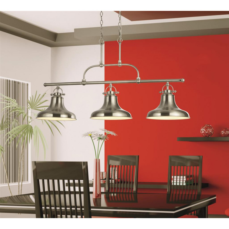 Moderní závěsné svítidlo DALLAS v klasickém avšak nadčasovém designu je ideální volbou pro osvětlení klasicky zařízeného i moderního interiéru. Tělo svítidla je vyrobeno z oceli v oblíbeném odstínu broušeného chromu. Světelná rampa se 3-mi stínidly o průměru 26cm jsou fixována na rampě.. To vše je volně zavěšeno na 2 řetízcích v barvě, jejichž závěsnou délku lze upravit dle potřeby.
